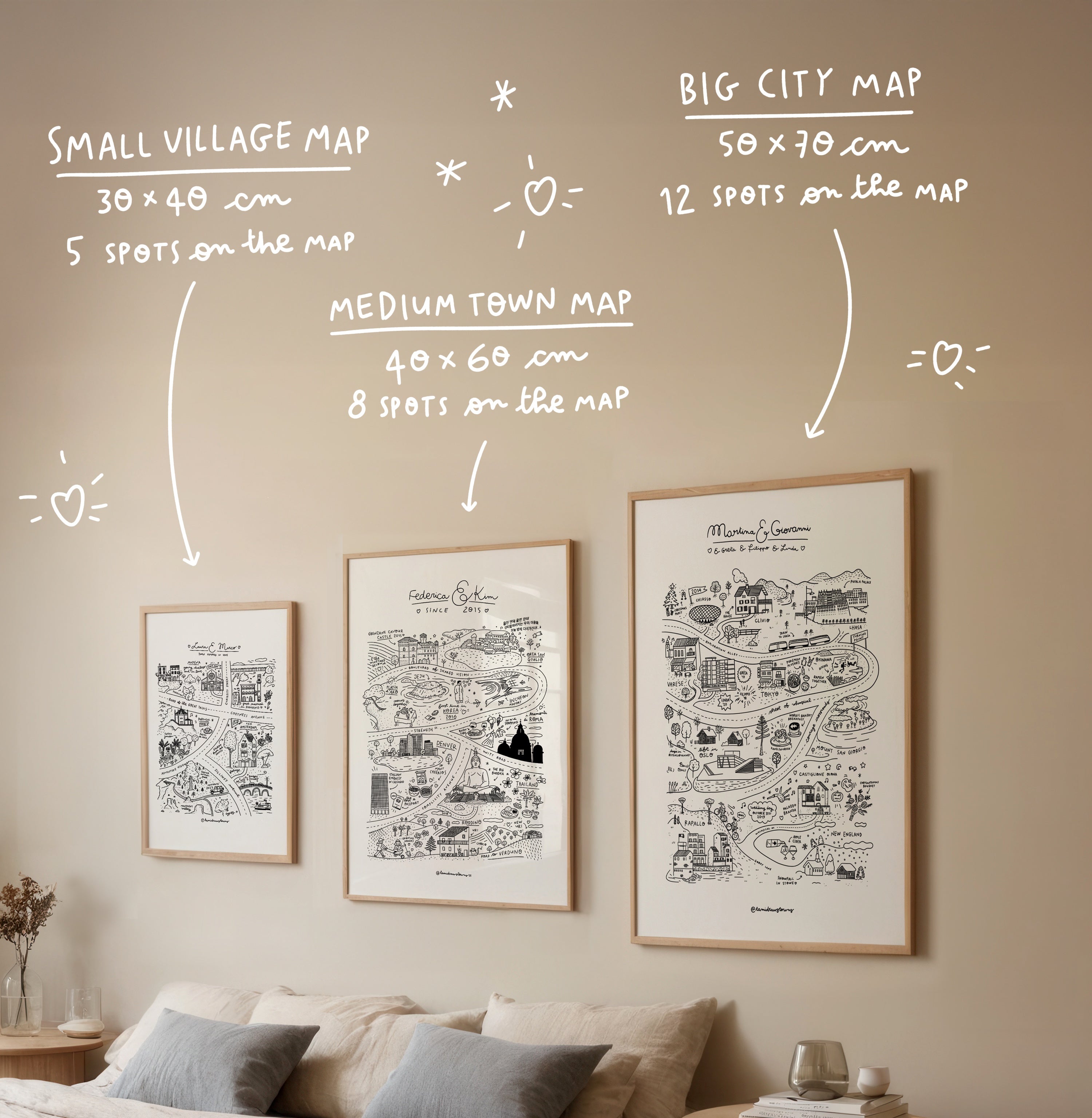 Capture your love story with a custom illustrated relationship town map — a unique, sentimental gift for weddings, anniversaries, housewarmings and special occasions.