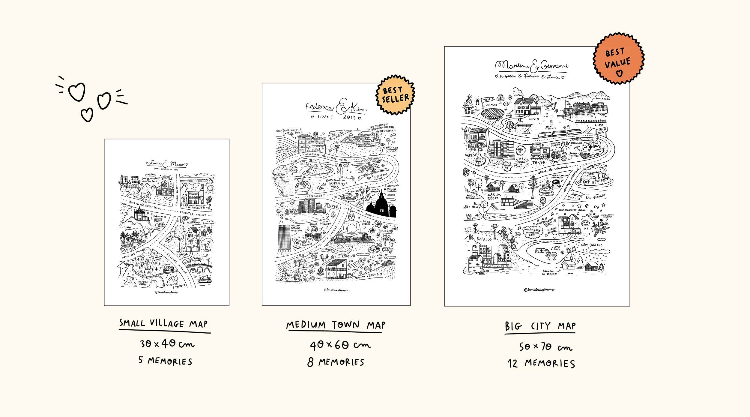 Each piece is a hand-drawn keepsake, part art print, part emotional cartography, perfect for anniversaries, weddings, and life’s biggest (or weirdest) adventures.
